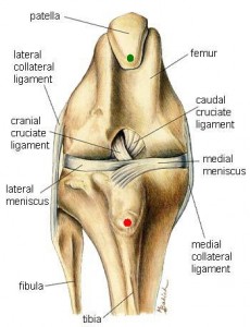 There are two ligaments inside the knee that cross – hence the name cruciate ligament. These ligaments provide knee stability for your pet while walking, running, playing ball, etc. If the anterior cruciate tears (the front most ligament and most commonly injured), the shinbone moves forward as the dog walks causing pain and damage to the cartilage in the knee.